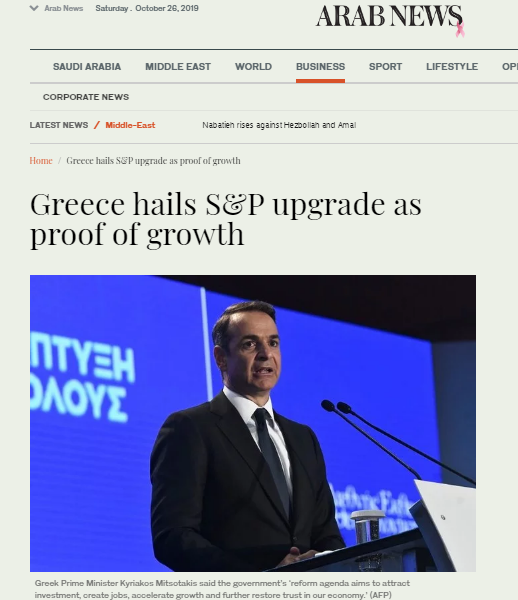 Η Ελλάδα καλωσόρισε την αναβάθμισή της από την Standard and Poor’s γράφει το Arab News, ως μια ακόμα απόδειξη για περαιτέρω ανάπτυξη μετά από μια κρίση που κράτησε σχεδόν 10 χρόνια.