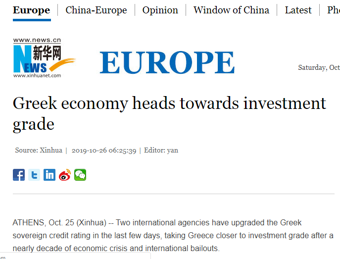 Δύο διεθνείς οίκοι αναβάθμισαν την πιστοληπτική ικανότητα της Ελλάδας τις τελευταίες ημέρες, οδηγώντας τη χώρα πιο κοντά στην επενδυτική βαθμίδα, αναφέρει το κρατικό πρακτορείο ειδήσεων της Κίνας Xihnua και υπενθυμίζει ότι πρόκειται για την πρώτη αναβάθμιση από μεγάλο οίκο μετά τις εκλογές του Ιουλίου.