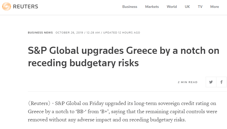 Οι δημοσιονομικοί κίνδυνοι για την Ελλάδα έχουν μειωθεί σημειώνει το πρακτορείο Reuters, αναφερόμενο στην αναβάθμιση από την S&P. H Ελλάδα που το καλοκαίρι του 2015 είχε επιβάλει capital controls ανακοίνωσε την άρση τους τον περασμένο Αύγουστο και η εξέλιξη αυτή σηματοδότησε τη σταθερή επιστροφή στη σταθερότητα μετά από τρία πακέτα διάσωσης που δόθηκαν από το 2010.