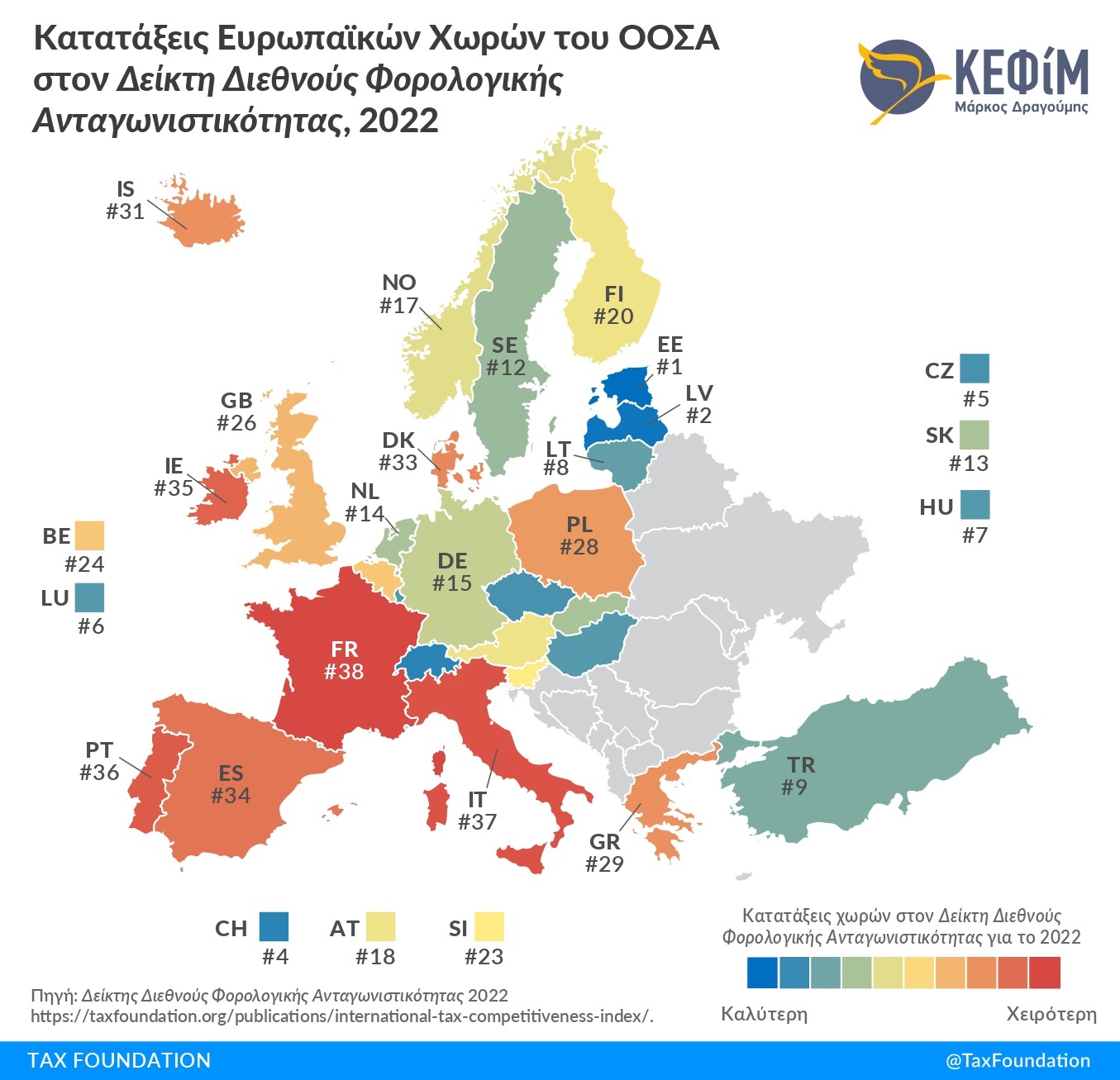 Την 29η θέση ανάμεσα στις 38 χώρες του ΟΟΣΑ καταλαμβάνει η Ελλάδα στον φετινό Δείκτη Διεθνούς Φορολογικής Ανταγωνιστικότητας που δημοσιεύει σήμερα το ΚΕΦίΜ στη χώρα μας σε συνεργασία με το Tax Foundation. Η κατάταξη της Ελλάδας βελτιώθηκε σημαντικά κατά 4 θέσεις, καθώς σύμφωνα με τα απολογιστικά στοιχεία, η χώρα μας πέρσι καταλάμβανε την 33η θέση. Πρόκειται για τη μεγαλύτερη, μαζί με την Τουρκία, βελτίωση μεταξύ των εξεταζόμενων χωρών.