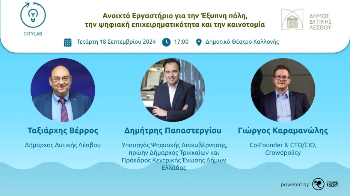 Η ψηφιακή αναβάθμιση οι καλές πρακτικές εφαρμογής ψηφιακής μετάβασης, η τεχνητή νοημοσύνη αλλά και ιδέες και προτάσεις για την ανάπτυξη και προώθηση της τοπικής οικονομίας και κοινωνίας είναι το αντικείμενο ανοιχτού εργαστηρίου που διοργανώνει ο Δήμος Δυτικής Λέσβου σε συνεργασία με την εταιρεία καινοτομίας και τεχνολογίας Crowdpolicy.