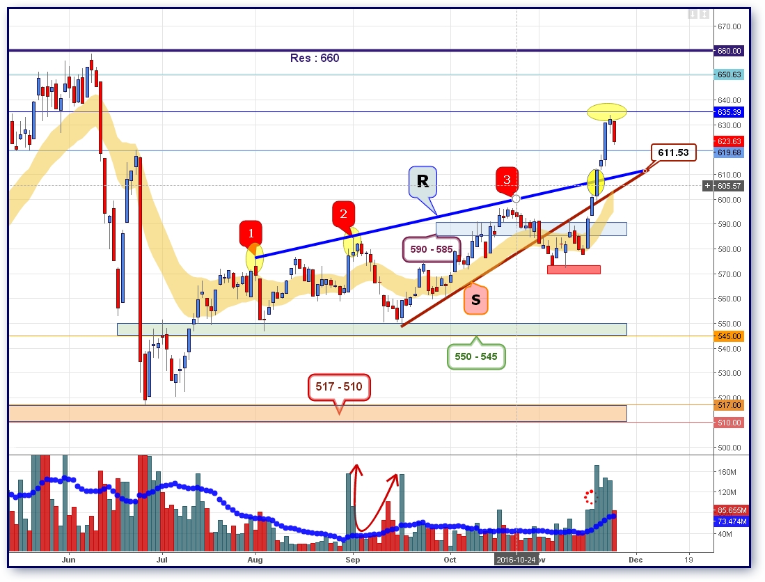 «Η επιβεβαιωμένη ανοδική διάσπαση της βραχυχρόνιας γραμμής αντίστασης R, στις 607 μονάδες, έδωσε τα κατάλληλα εφόδια στο Γενικό Δείκτη για την άμεση προσέγγιση της περιοχής αντίστασης, στις 635 μονάδες, ανοίγοντας το οπτικό πεδίο για τις 650 με 660 μονάδες.