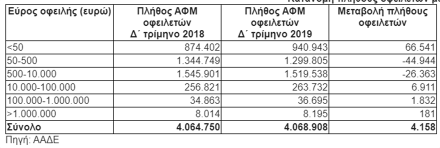 Από την κατανομή του πλήθους των οφειλετών ανάλογα με το ύψος του χρέους τους προκύπτει ότι ο συνολικός αριθμός τους αυξήθηκε κυρίως λόγω της αύξησης των μικροοφειλετών. Ειδικότερα, οι οφειλέτες έφθασαν στο τέλος του 2019 τα 4.068.908 φυσικά και νομικά πρόσωπα, αυξημένα κατά 4.158 σε σύγκριση με το τέλος του 2018. Ωστόσο, η μεγαλύτερη αύξηση του αριθμού οφειλετών κατεγράφη στην κατηγορία οφειλών κάτω των 50 ευρώ: έφθασαν τα 940.943 φυσικά και νομικά πρόσωπα (23,12% του συνόλου των οφειλετών), αυξημένα κατά 66.541, και τα χρέη τους διαμορφώθηκαν στα 11,6 εκατ. ευρώ, διευρυμένα κατά 900.000 ευρώ.