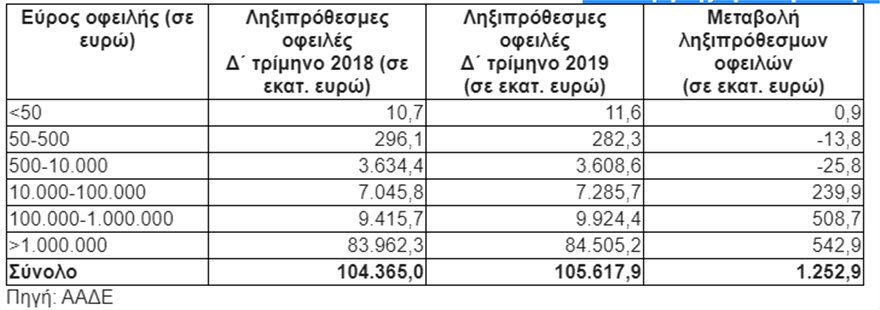 Στον αντίποδα, το σύνολο των ληξιπρόθεσμων οφειλών προς τη Φορολογική Διοίκηση αυξήθηκε στα 105,618 δισ. ευρώ το Δ΄ τρίμηνο του 2019, έναντι 104,365 δισ. ευρώ το αντίστοιχο διάστημα του 2018. Με βάση το ύψος της οφειλής, η μεγαλύτερη αύξηση του ληξιπρόθεσμου υπόλοιπου (542,9 εκατ. ευρώ) εντοπίζεται στην υψηλότερη κατηγορία οφειλών, δηλαδή στις οφειλές που ξεπερνούν το 1 εκατ. ευρώ.