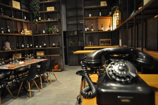Την ανάπλαση του χώρου ανέλαβαν οι Maoro και Giuzeppe Alito που έβαλαν όλη τους την μαεστρία για να τον κάνουν αγνώριστο. Λιτές, βιομηχανικές γραμμές σε σκούρους χρωματισμούς -το γκρι και το μαύρο κυριαρχούν χωρίς να τον κάνουν αφιλόξενο. Σε αυτό συμβάλουν βέβαια και οι μεγάλες τζαμαρίες που επιτρέπουν το φως να γεμίζει ευχάριστα το μαγαζί. Περιφερειακά μπήκαν ψηλά ράφια με βιβλία για το κρασί, γλάστρες με φυτά και παλιά vintage χρωματιστά αντικείμενα. Εκείνο όμως που τραβά το βλέμμα και δεν το αφήνει να ξεκολλά από πάνω του, είναι το τετράγωνο μπαρ στο κέντρο του μαγαζιού. Με ωραία ξύλινη μπάρα, ψηλά αναπαυτικά σκαμπό και μια εντυπωσιακά ογκώδη κατασκευή από ξύλινες δοκούς -που μοιάζουν με ρίζες δέντρου που περιπλέκονται η μία πάνω στην άλλη- να το σκεπάζει.