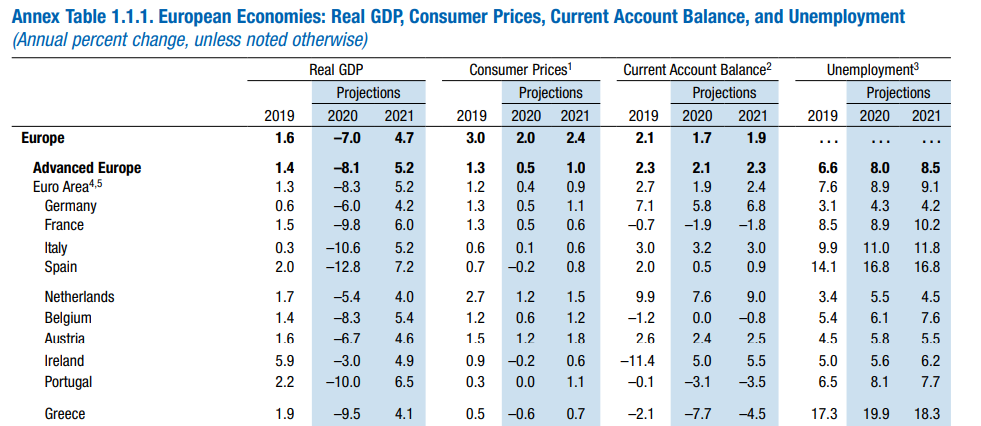 Τα στοιχεία για τις παγκόσμιες οικονομικές προοπτικές στο World Economic Outlook που το ΔΝΤ ανακοίνωσε πριν λίγη ώρα στην από την Ουάσιγκτον, δείχνουν για το 2020 ύφεση 9,5% στην Ελλάδα (αντί 10% που προέβλεπε πριν 6 μήνες το Ταμείο) και διψήφια ποσοστά για Ισπανία (-12,8%), Ιταλία (-10,6%) και Πορτογαλία (10%).