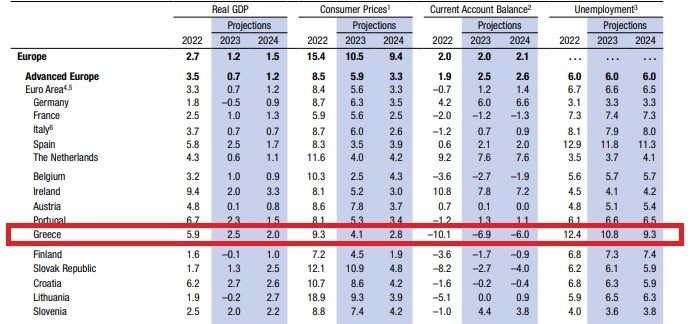 Aνάπτυξη της ελληνικής οικονομίας κατά 2,5% το 2023 και κατά 2% το 2024 (από 5,9% το 2022) προβλέπει το Διεθνής Νομισματικό Ταμείο (ΔΝΤ), στο πλαίσιο της επικαιροποιημένης έκθεσης «World Economic Outlook», η οποία δημοσιεύθηκε το πρωί της Τρίτης (10/10).