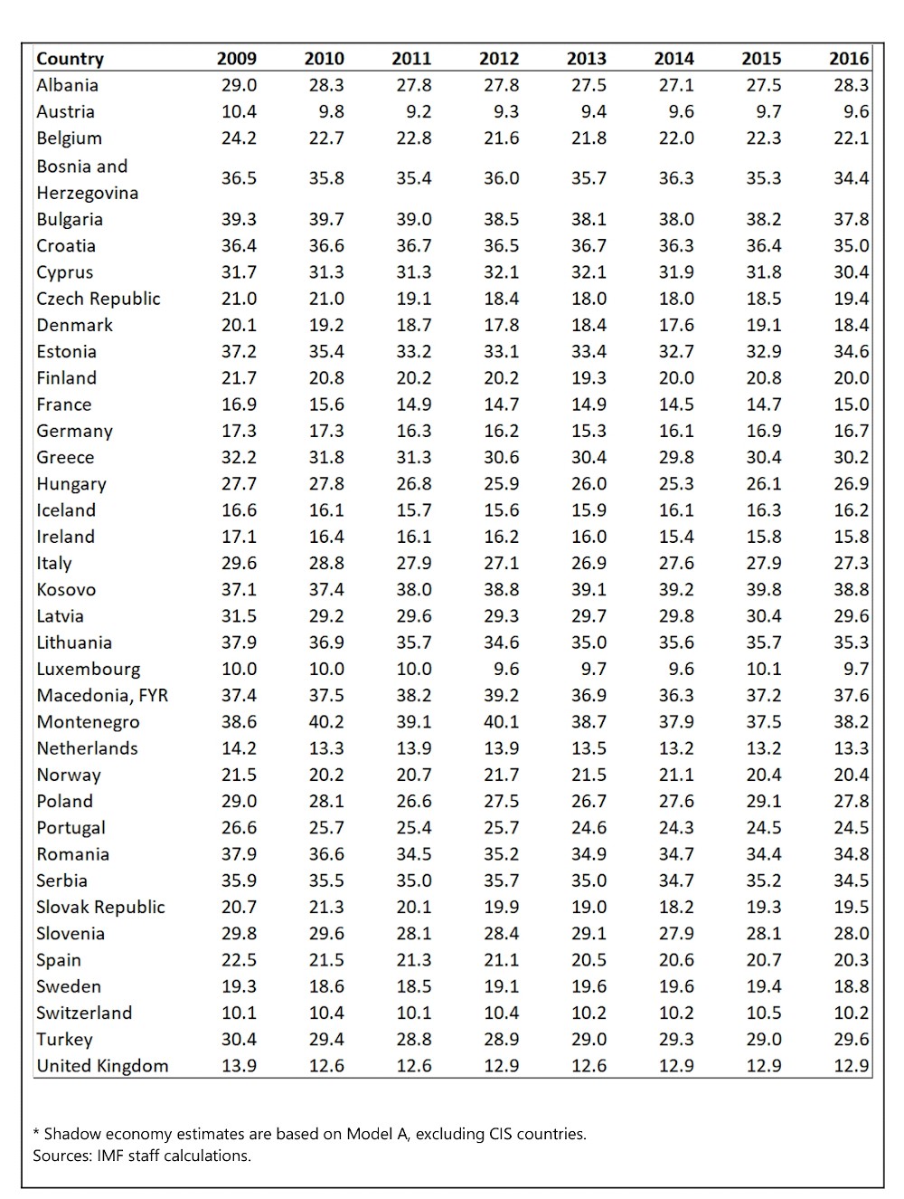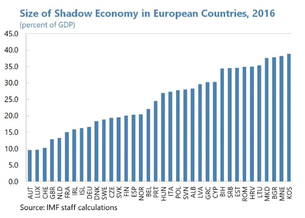 Καταγράφοντας το μέγεθος του προβλήματος, το ΔΝΤ σημειώνει ότι η παραοικονομία στην Ευρώπη έχει μεγάλος εύρος, καθώς κυμαίνεται από λιγότερο του 10% και ξεπερνά το 40%. Στις αποκαλούμενες «αναπτυγμένες» χώρες της Ε.Ε., η παραοικονομία διαμορφώνεται στο 10-20% κατά μέσο όρο, ενώ στις «αναδυόμενες» χώρες ο δείκτης ανεβαίνει στο 30-35%.