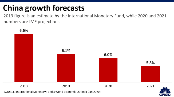 Η πρόβλεψη για την ανάπτυξη της Κίνας για το 2020 αναθεωρήθηκε προς τα πάνω κατά 0,2% στο 6%, σύμφωνα με το ΔΝΤ. Αυτό οφείλεται εν μέρει στην πρώτη φάση της εμπορικής συμφωνίας με τις ΗΠΑ, η οποία είναι πιθανό να μειώσει κάποια ρίσκα που αντιμετωπίζει η Νο2 οικονομία του πλανήτη.