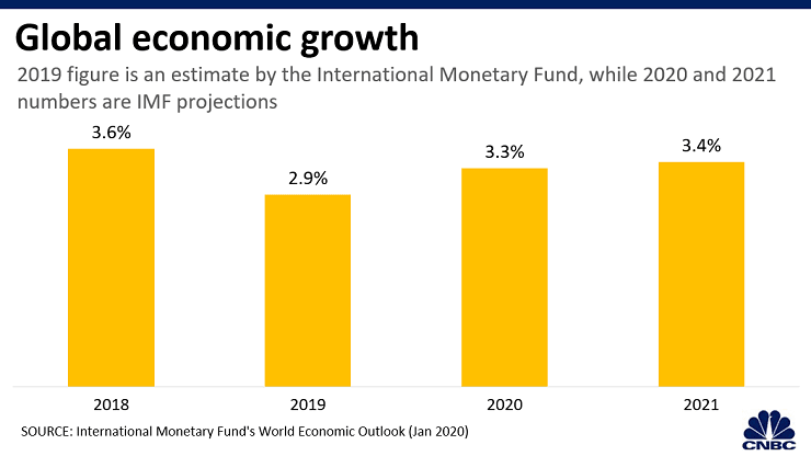 Το ΔΝΤ έχει προβλέψει ότι η παγκόσμια οικονομία θα ανακάμψει στο 3,3% φέτος από εκτίμηση 2,9% πέρυσι. Εντούτοις, η πρόβλεψη για το 2020 αποτελεί καθοδική αναθεώρηση από το 3,4% στο παγκόσμιο οικονομικό outlook τον Οκτώβριο του 2019.