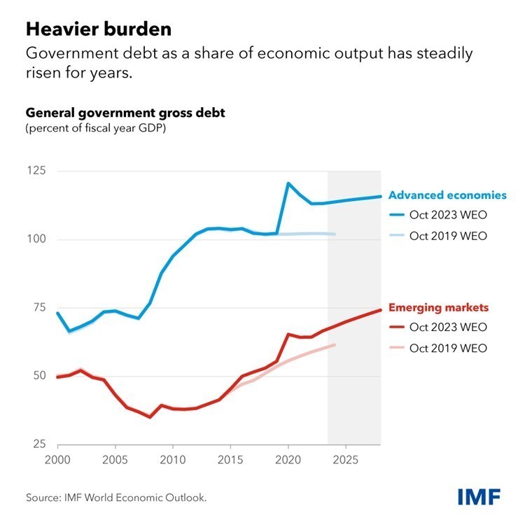 Ως αποτέλεσμα, το δημόσιο χρέος ως κλάσμα του ακαθάριστου εγχώριου προϊόντος έχει αυξηθεί σημαντικά τις τελευταίες δεκαετίες, τόσο στις προηγμένες όσο και στις αναδυόμενες και μεσαίου εισοδήματος οικονομίες. Αναμένεται να φτάσει το 120% και το 80% της παραγωγής αντίστοιχα έως το 2028.»
