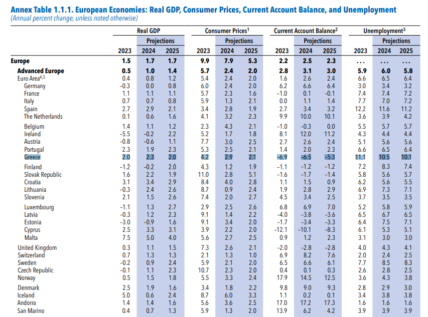Ανάπτυξη 2,3% για φέτος και 2% για το 2025 προβλέπει για την ελληνική οικονομία το Διεθνές Νομισματικό Ταμείο, όπως φαίνεται από την έκθεση World Economic Outlook.