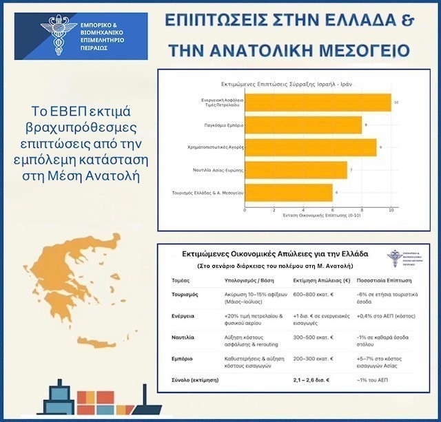 Τις πιθανές επιπτώσεις από τη νέα σύρραξη και τη διαταραχή των εμπορευματικών ροών θα βιώσουν και πάλι τα λιμάνια της Ανατολικής Μεσογείου και ιδιαίτερα το λιμάνι του Πειραιά το οποίο, ως γνωστόν, έχει απωλέσει μεγάλο μέρος της εμπορευματικής κίνησής του από την κατάσταση στην Ερυθρά Θάλασσα. Η νέα σύρραξη εξανεμίζει τις ελπίδες των Μεσογειακών λιμένων για μια ειρηνική περίοδο ανάκαμψης, καθώς μεγάλες εταιρίες διακίνησης εμπορευματοκιβωτίων, διαβλέποντας την κατάσταση, θα «ανακρούσουν πρύμναν» σε σχεδιασμούς διέλευσης από το Σουέζ. Παράλληλα, η άνοδος των τιμών πετρελαίου και φυσικού αερίου, ως απότοκο της αντίδρασης των αγορών θα επιβαρύνει άμεσα τις οδικές, ακτοπλοϊκές και αεροπορικές μεταφορές, το κόστος παραγωγής και τις τιμές ηλεκτρικής ενέργειας, ενισχύοντας τις πληθωριστικές πιέσεις, ιδίως σε τρόφιμα και ενέργεια.