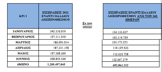 Ειδικότερα, όπως προκύπτει απο τα στοιχεία, οι νέες ληξιπρόθεσμες οφειλές προς το Δημόσιο που δημιουργήθηκαν το εξάμηνο Ιανουάριος – Ιούνιος 2021 ανήλθαν στα 3,234 δισ. ευρώ έναντι 2,584 δισ. ευρώ το αντίστοιχο εξάμηνο πέρυσι (αύξηση 25%). Τον Ιούνιο οι νέες ληξιπρόθεσμες οφειλές ανήλθαν σε 334 εκατ. ευρώ έναντι 61 εκατ. ευρώ τον ίδιο μήνα πέρυσι (αύξηση 443%).