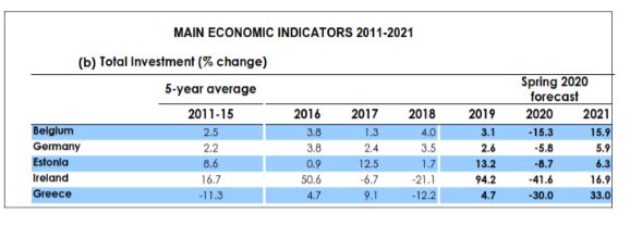 Για τις επενδύσεις η Κομισιόν προβλέπει κάθετη βουτιά -30%, αλλά και κάθετη άνοδο 33% το 2021.