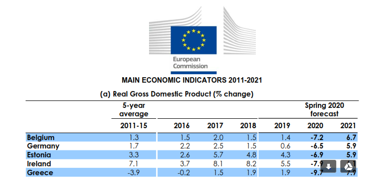 Η Ευρωπαϊκή Επιτροπή προέβλεψε σήμερα ‘ιστορική’ ύφεση στην ΕΕ φέτος, με πτώση-ρεκόρ του ΑΕΠ κατά 7,7% στην ευρωζώνη και στη συνέχεια ανάκαμψη κατά 6,3% το 2021. «Η Ευρώπη βρίσκεται μπροστά σε ένα άνευ προηγουμένου οικονομικό σοκ μετά τη Μεγάλη Ύφεση (του 1929). Το βάθος της ύφεσης και η ισχύς της ανάκαμψης θα είναι διαφορετικά από χώρα σε χώρα», τόνισε ο Ευρωπαίος επίτροπος Οικονομίας Πάολο Τζεντιλόνι.
