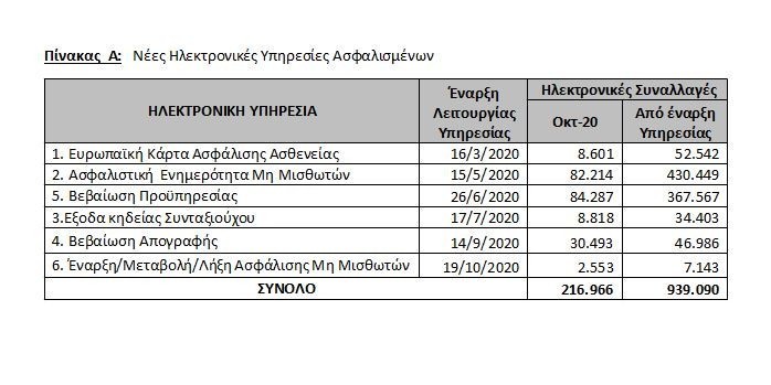 α. Έξι ολοκληρωμένες ηλεκτρονικές υπηρεσίες (πίνακας Α) τέθηκαν σταδιακά σε λειτουργία από τον Μάρτιο του 2020, μέσω των οποίων έχουν ολοκληρωθεί, μέχρι σήμερα, 939.090 συναλλαγές ασφαλισμένων.