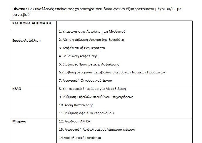 Στο πλαίσιο αυτό, η προσέλευση των ασφαλισμένων, μέχρι τις 30 Νοεμβρίου, είναι δυνατή μόνο κατόπιν ραντεβού και για τη διεκπεραίωση μόνο συναλλαγών επείγοντος χαρακτήρα, καθώς εκ περιτροπής μέρος του προσωπικού προσέρχεται στα υποκαταστήματα και το υπόλοιπο εργάζεται εξ αποστάσεως. Οι 21 συναλλαγές επείγοντος χαρακτήρα που εξυπηρετούνται, μέχρι τις 30 Νοεμβρίου, αποτυπώνονται στον πίνακα Β.