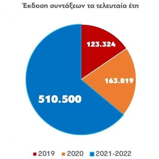 Αναλυτικά, οι εκδόσεις κύριων συντάξεων το 2021 και το 2022 έφτασαν στις 510.500. Το 2021 εκδόθηκαν 224.434 κύριες συντάξεις, ενώ το 2022 εκδόθηκαν 287.000 (αύξηση 28%). Μάλιστα, το 2022 εκδόθηκαν 163.000 περισσότερες συντάξεις σε σχέση με το 2019 όπου εκδόθηκαν μόλις 123.324 (αύξηση 132%).