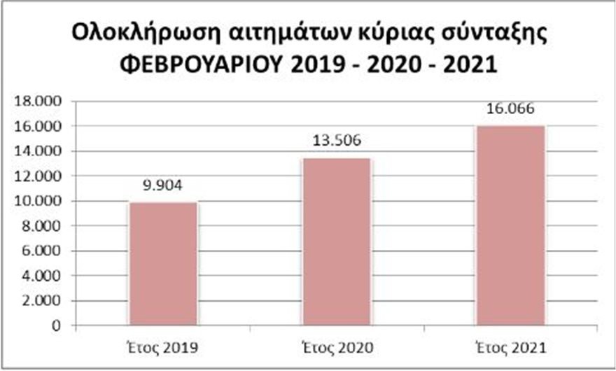 Οσον αφορά τον ρυθμό έκδοσης των συντάξεων τον Φεβρουάριο του 2021 ολοκληρώθηκαν 16.066 αιτήματα συνταξιοδότησης συγκριτικά με 13.506 τον Φεβρουάριο του 2020 και 9.904 τον αντίστοιχο μήνα του 2019.
