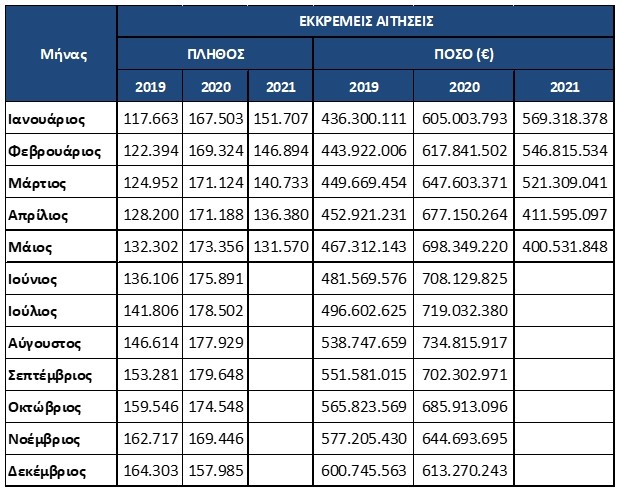 Η αύξηση του ρυθμού ολοκλήρωσης των αιτημάτων τον Μάιο 2021 ανέρχεται σε 90,3% έναντι του Μαΐου του 2020, και 81,7% έναντι του Μαΐου 2019.