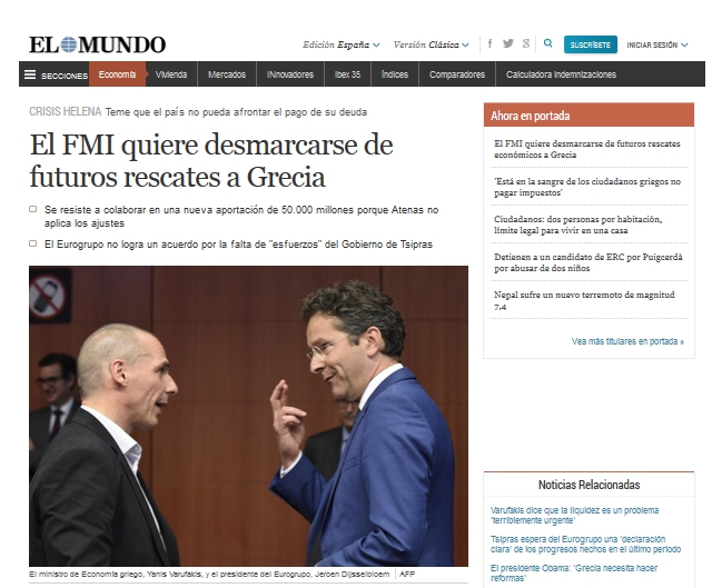 “Το ΔΝΤ σηματοδότησε στο Eurogroup ότι δεν επιθυμεί να συμμετάσχει σε ένα νέο πακέτο διάσωσης για την Ελλάδα, το οποίο μπορεί να φτάσει έως και τα 50.000 ευρώ, και που είναι ζωτικό για τη βιωσιμότητα της ελληνικής οικονομίας. Η απουσία ρεαλιστικών μεταρρυθμίσεων από την πλευρά της κυβέρνησης Τσίπρα αλλά και όι προκλήσεις των τελευταίων εβδομάδων, όπως η επαναπρόσληψη των δημοσίων υπαλλήλων, έχουν κάνει το Ταμείο να θέλει να αφήσει τη βοήθεια της Ελλάδας στην Ευρωζώνη και την ΕΚΤ” αναφέρει χαρακτηριστικά η El Mundo.