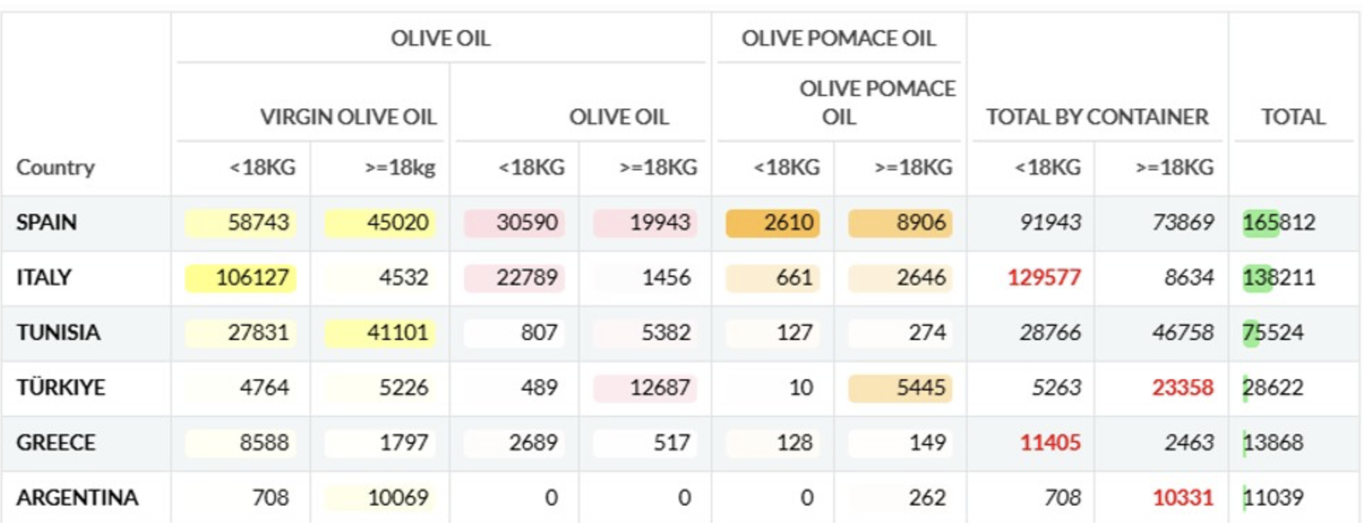 Συνολικά για το ελαιόλαδο που εξάγεται προς τις ΗΠΑ από όλες τις μεγάλες χώρες – εξαγωγείς υπερέχουν τα έξτρα και βρώσιμα παρθένα με 337.266 τόνους (77,1%) έναντι 100.044 τόνων (22,9%) του ελαιολάδου κουπέ/ραφινέ.