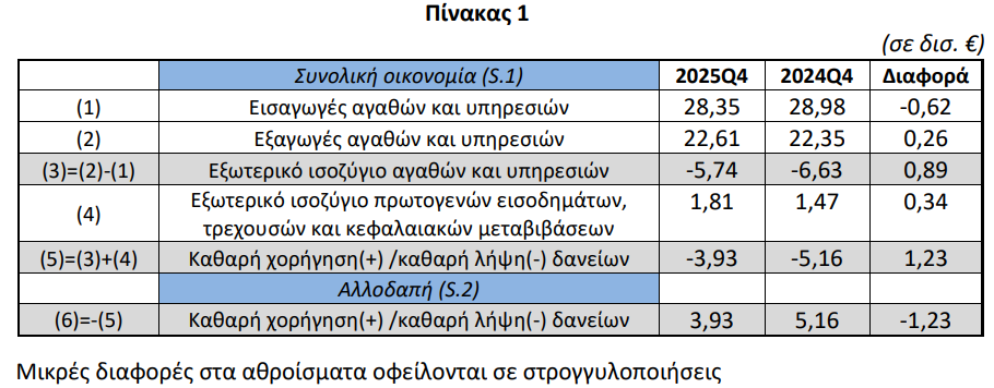 Ως αποτέλεσμα των ανωτέρω, η συνολική οικονομία παρουσίασε καθαρή λήψη δανείων 3,93 δισ. ευρώ κατά το 4ο τρίμηνο του 2025 από την αλλοδαπή. Το αντίστοιχο περσινό τρίμηνο η καθαρή λήψη δανείων ανέρχονταν σε 5,16 δισ. ευρώ.