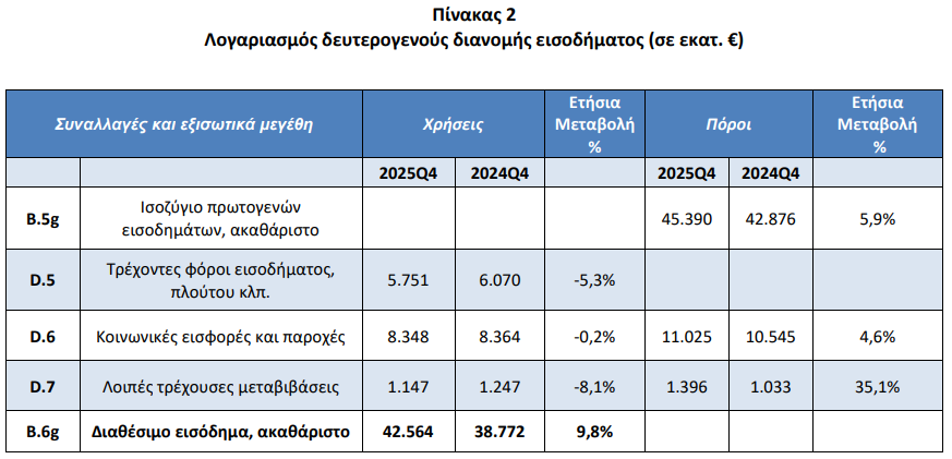 Κατά το 4ο τρίμηνο του 2025, το διαθέσιμο εισόδημα του τομέα των νοικοκυριών και των μη κερδοσκοπικών ιδρυμάτων που εξυπηρετούν νοικοκυριά (ΜΚΙΕΝ) αυξήθηκε κατά 9,8% σε σύγκριση με το αντίστοιχο τρίμηνο του προηγούμενου έτους, από 38,77 δισ. ευρώ σε 42,56 δισ. ευρώ.