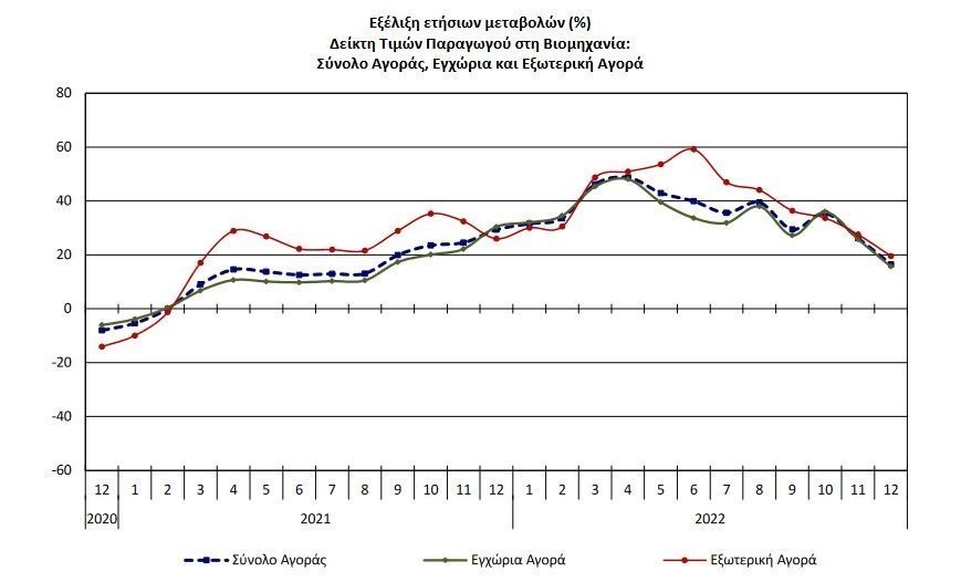 Αύξηση 16,5% σημείωσε ο γενικός δείκτης τιμών παραγωγού στη βιομηχανία (σύνολο εγχώριας και εξωτερικής αγοράς) τον Δεκέμβριο πέρυσι σε σύγκριση με τον αντίστοιχο δείκτη του Δεκεμβρίου 2021, έναντι αύξησης 29,4% που σημειώθηκε κατά την αντίστοιχη σύγκριση των δεικτών το 2021 με το 2020.