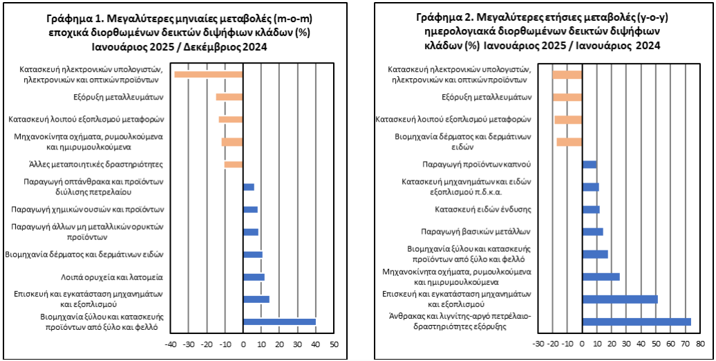 Κατά τη σύγκριση των δεικτών του Ιανουαρίου 2025 με τους αντίστοιχους δείκτες του Ιανουαρίου 2024, η μεγαλύτερη ποσοστιαία αύξηση καταγράφηκε στον κλάδο εξόρυξης άνθρακα και λιγνίτη – άντλησης πετρελαίου και φυσικού αερίου – υποστηρικτικών δραστηριοτήτων εξόρυξης, ενώ η μεγαλύτερη ποσοστιαία μείωση καταγράφηκε στον κλάδο κατασκευής ηλεκτρονικών υπολογιστών, ηλεκτρονικών και οπτικών προϊόντων.