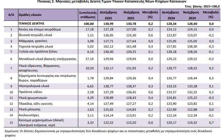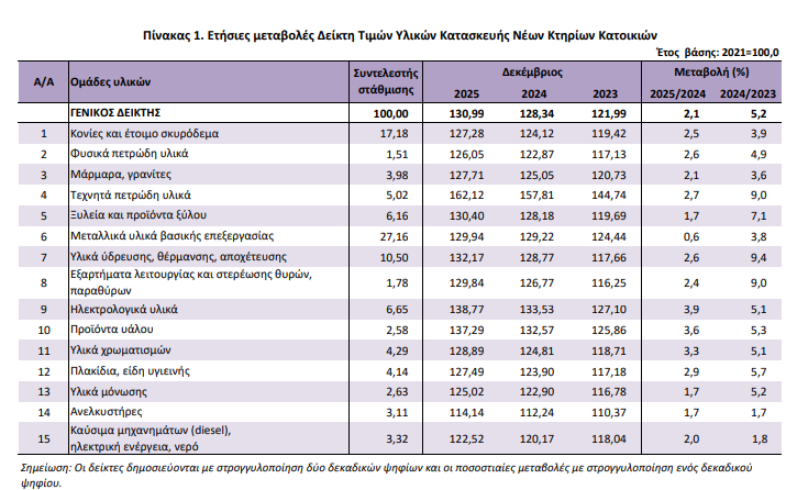 Όπως ανακοίνωσε η ΕΛΣΤΑΤ, ο γενικός δείκτης τιμών υλικών κατασκευής νέων κτιρίων κατοικιών παρουσίασε αύξηση 2,1% τον Δεκέμβριο 2025 σε σύγκριση με τον αντίστοιχο δείκτη του Δεκεμβρίου 2024, έναντι αύξησης 5,2% που σημειώθηκε κατά τη σύγκριση των αντίστοιχων δεικτών το 2024 με το 2023.