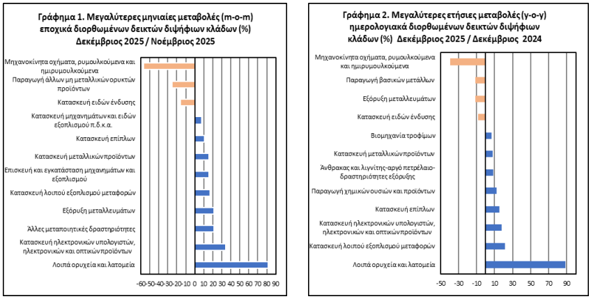Ο δείκτης του κλάδου λοιπών ορυχείων και λατομείων, σημείωσε τη μεγαλύτερη ποσοστιαία αύξηση ενώ ο δείκτης του κλάδου κατασκευής μηχανοκίνητων οχημάτων, ρυμουλκούμενων και ημιρυμουλκούμενων οχημάτων, σημείωσε τη μεγαλύτερη ποσοστιαία μείωση, κατά τον Δεκέμβριο 2025 σε σχέση με τον Νοέμβριο 2025. Κατά τη σύγκριση των δεικτών του Δεκεμβρίου 2025 με τους αντίστοιχους δείκτες του Δεκεμβρίου 2024, η μεγαλύτερη ποσοστιαία αύξηση καταγράφηκε στον κλάδο λοιπών ορυχείων και λατομείων, ενώ η μεγαλύτερη ποσοστιαία μείωση καταγράφηκε στον κλάδο κατασκευής μηχανοκίνητων οχημάτων, ρυμουλκούμενων και ημιρυμουλκούμενων οχημάτων.