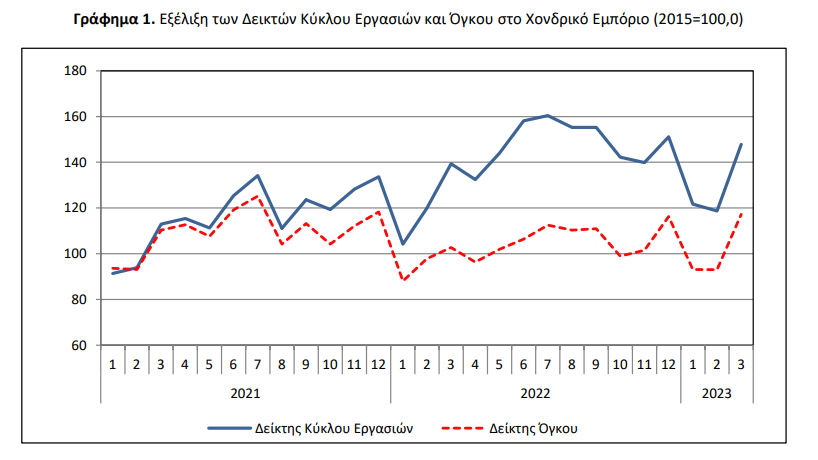 Η Ελληνική Στατιστική Αρχή ανακοινώνει τους μηνιαίους Δείκτες Κύκλου Εργασιών και Όγκου στο Χονδρικό Εμπόριο, με έτος βάσης 2015=100,0 της περιόδου Ιανουαρίου-Μαρτίου 2023, η εξέλιξη των οποίων, σύμφωνα με προσωρινά στοιχεία χωρίς ημερολογιακή και εποχική διόρθωση, έχει ως εξής: