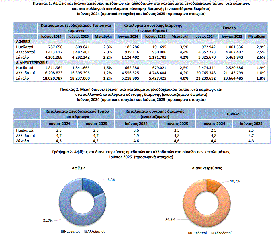 Σύμφωνα με τα στοιχεία της ΕΛΣΤΑΤ, τον Ιούνιο 2025 καταγράφηκαν 5.463.943 αφίξεις και 23.664.485 διανυκτερεύσεις σε τουριστικά καταλύματα, αριθμοί που αντιστοιχούν σε άνοδο 2,6% και 1,8% αντίστοιχα σε σχέση με τον Ιούνιο 2024.