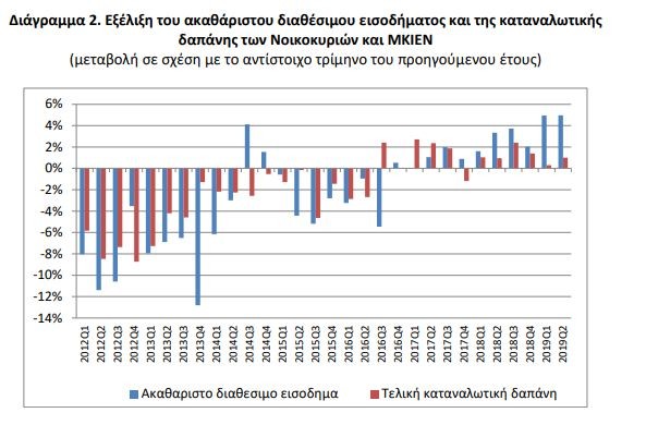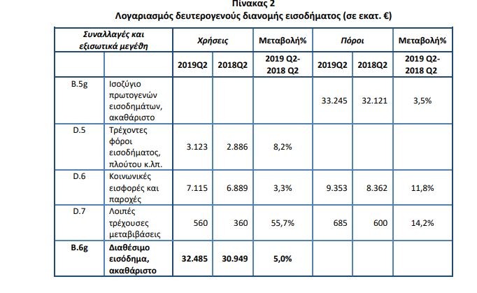 Συγκεκριμένα, σύμφωνα με τα στοιχεία που ανακοίνωσε η Στατιστική Αρχή κατά το δεύτερο τρίμηνο του 2019, το διαθέσιμο εισόδημα του τομέα των νοικοκυριών και των μη κερδοσκοπικών ιδρυμάτων που εξυπηρετούν νοικοκυριά (ΜΚΙΕΝ) (S.1M) αυξήθηκε κατά 5,0% σε σύγκριση με το αντίστοιχο τρίμηνο του προηγούμενου έτους, από 30,9 δισ. ευρώ σε 32,5 δισ. ευρώ.