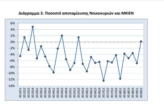 Το ποσοστό αποταμίευσης των νοικοκυριών και των ΜΚΙΕΝ, που ορίζεται ως η ακαθάριστη αποταμίευση προς το ακαθάριστο διαθέσιμο εισόδημα, ήταν 0,2% κατά το δεύτερο τρίμηνο του 2019, σε σύγκριση με -3,7% το δεύτερο τρίμηνο του 2018 (Διάγραμμα 3).