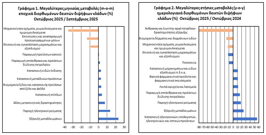 Ο δείκτης του κλάδου εξόρυξης μεταλλευμάτων, σημείωσε τη μεγαλύτερη ποσοστιαία αύξηση ενώ ο δείκτης του κλάδου κατασκευής μηχανοκίνητων οχημάτων, ρυμουλκούμενων και ημιρυμουλκούμενων οχημάτων, σημείωσε τη μεγαλύτερη ποσοστιαία μείωση, κατά τον Οκτώβριο 2025 σε σχέση με τον Σεπτέμβριο 2025. Κατά τη σύγκριση των δεικτών του Οκτωβρίου 2025 με τους αντίστοιχους δείκτες του Οκτωβρίου 2024, η μεγαλύτερη ποσοστιαία αύξηση καταγράφηκε στον κλάδο κατασκευής ηλεκτρονικών υπολογιστών, ηλεκτρονικών και οπτικών προϊόντων, ενώ η μεγαλύτερη ποσοστιαία μείωση καταγράφηκε στους κλάδους εξόρυξης άνθρακα και λιγνίτη – άντλησης αργού πετρελαίου και φυσικού αερίου – υποστηρικτικών δραστηριοτήτων εξόρυξης.