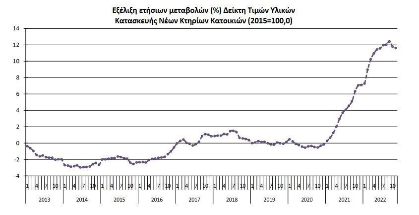 Όπως ανακοίνωσε η ΕΛΣΤΑΤ, ο γενικός δείκτης τιμών υλικών κατασκευής νέων κτιρίων κατοικιών παρουσίασε αύξηση 11,6% τον Νοέμβριο 2022 σε σύγκριση με τον αντίστοιχο δείκτη του Νοεμβρίου 2021, έναντι αύξησης 7,1% που σημειώθηκε κατά τη σύγκριση των αντίστοιχων δεικτών το 2021 με το 2020.