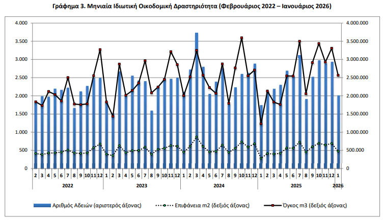 Οι εκδοθείσες άδειες Ιδιωτικής Οικοδομικής Δραστηριότητας, στο σύνολο της Χώρας, κατά τον μήνα Ιανουάριο 2026 ανήλθαν σε 2.013 οικοδομικές άδειες, που αντιστοιχούν σε 474.263 m2 επιφάνειας και 2.563.422 m3 όγκου, παρουσιάζοντας αύξηση κατά 15,3% στον αριθμό των οικοδομικών αδειών, αύξηση κατά 67,9% στην επιφάνεια και αύξηση κατά 107,7% στον όγκο, σε σχέση με τον αντίστοιχο μήνα του 2025.