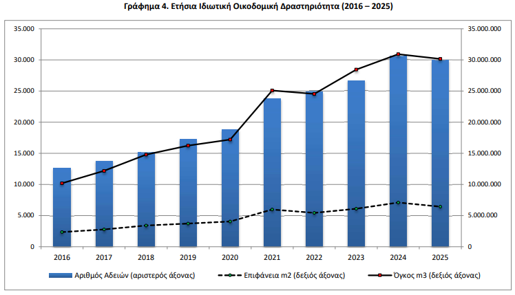 Κατά την περίοδο των τελευταίων δώδεκα μηνών, δηλαδή από τον Φεβρουάριο 2025 έως τον Ιανουάριο 2026, το μέγεθος της Συνολικής Οικοδομικής Δραστηριότητας (Ιδιωτικής-Δημόσιας) με βάση τις εκδοθείσες οικοδομικές άδειες, στο σύνολο της Χώρας, ανήλθε σε 30.471 οικοδομικές άδειες, που αντιστοιχούν σε 6.768.876 m2 επιφάνειας και 32.396.022 m3 όγκου. Σε σχέση με την αντίστοιχη περίοδο Φεβρουαρίου 2024 – Ιανουαρίου 2025 παρατηρήθηκε μείωση κατά 0,5% στον αριθμό των οικοδομικών αδειών, μείωση κατά 4,9% στην επιφάνεια και αύξηση κατά 3,8% στον όγκο.