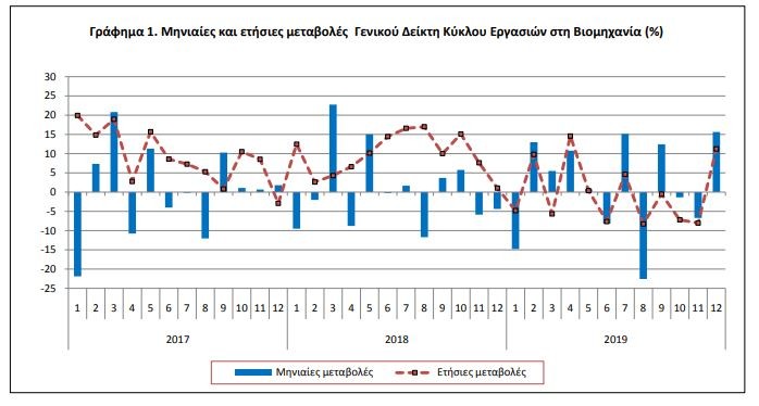 Παράλληλα, ο Γενικός Δείκτης Κύκλου Εργασιών στη Βιομηχανία του μηνός Δεκεμβρίου 2019, σε σύγκριση με τον αντίστοιχο δείκτη του Νοεμβρίου 2019, παρουσίασε άνοδο 15,7%.