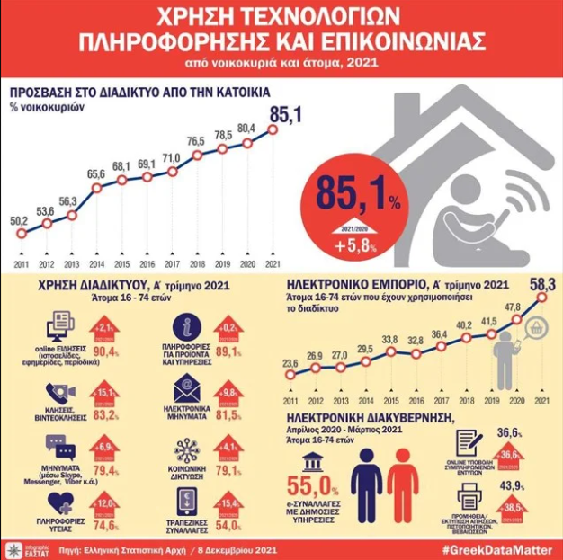 Το 85,1% των νοικοκυριών έχουν πρόσβαση στο διαδίκτυο από την κατοικία τους σε σύγκριση με το 2011 που κυμαίνονταν στο 50,2%, καταγράφοντας αύξηση 69,5%. Η αύξηση μεταξύ 2020 και του Α’ Τριμήνου του 2021 διαμορφώθηκε στο 5,8%, σύμφωνα με τα στοιχεία της ΕΛΣΤΑΤ για το Α’ τρίμηνο του 2021 που αποτυπώνουν σημαντική αύξηση στην τελευταία δεκαετία (2011-2021) του ρυθμού πρόσβασης των ελληνικών νοικοκυριών στο Διαδίκτυο.