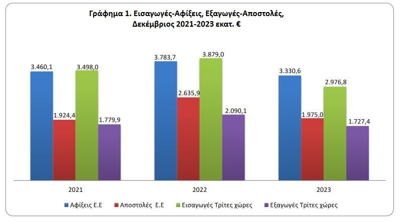 Η συνολική αξία των εισαγωγών – αφίξεων, κατά το μήνα Δεκέμβριο 2023 ανήλθε στο ποσό των 6,307.4 δισ. ευρώ