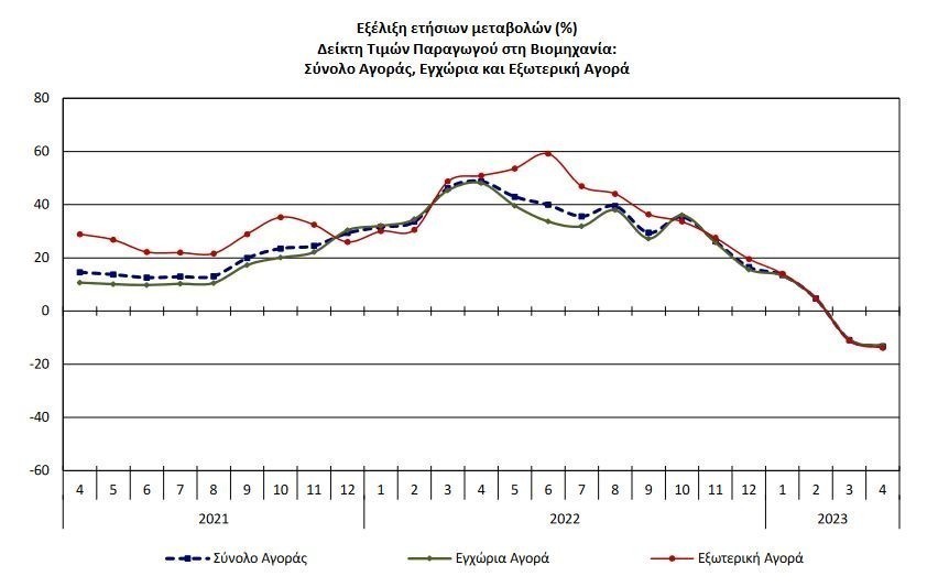 Μείωση 13,3% σημείωσε ο γενικός δείκτης τιμών παραγωγού στη βιομηχανία (σύνολο εγχώριας και εξωτερικής αγοράς) τον Απρίλιο εφέτος σε σύγκριση με τον αντίστοιχο δείκτη του Απριλίου 2022, έναντι αύξησης 48,8% που σημειώθηκε κατά την αντίστοιχη σύγκριση των δεικτών το 2022 με το 2021. Εξέλιξη που, κατά κύριο λόγο οφείλεται στην πτώση των διεθνών τιμών του πετρελαίου, ενώ αντίθετα ο δείκτης της βιομηχανίας τροφίμων κινήθηκε εκ νέου ανοδικά.