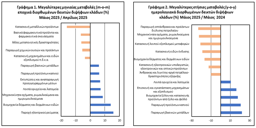 Κατά τη σύγκριση των δεικτών του Μαΐου 2025 με τους αντίστοιχους δείκτες του Μαΐου 2024, η μεγαλύτερη ποσοστιαία μείωση καταγράφηκε στον κλάδο παραγωγής οπτάνθρακα και προϊόντων διύλισης πετρελαίου, ενώ η μεγαλύτερη ποσοστιαία αύξηση καταγράφηκε στον κλάδο παραγωγής βασικών μετάλλων.