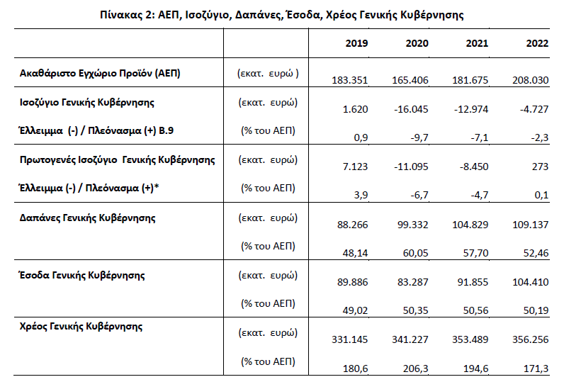 Μικρότερο έλλειμμα γενικής κυβέρνησης (μαζί με τις δαπάνες για τόκους, τράπεζες κλπ) που έκλεισε σε 2,3%. Κατόπιν αναθεώρησης από την ΕΛΣΤΑΤ, και το συνολικό δημοσιονομικό έλλειμμα του «πανδημικού» 2021 μειώθηκε σε 7,1% αντί 7,5% που είχε εκτιμηθεί τον περασμένο Οκτώβριο!