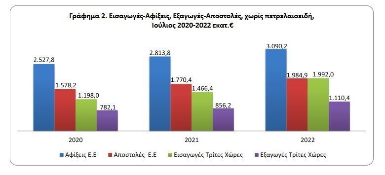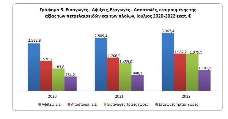 Η αντίστοιχη αξία χωρίς τα πετρελαιοειδή κατά τον μήνα Ιούλιο 2022 παρουσίασε αύξηση κατά 468,7 εκατ. ευρώ δηλαδή 17,8% και η αντίστοιχη αξία χωρίς τα πετρελαιοειδή και τα πλοία κατά τον μήνα Ιούλιο 2022 παρουσίασε αύξηση κατά 467,1 εκατ. ευρώ, δηλαδή 17,9%, σε σχέση με τον μήνα Ιούλιο 2021.