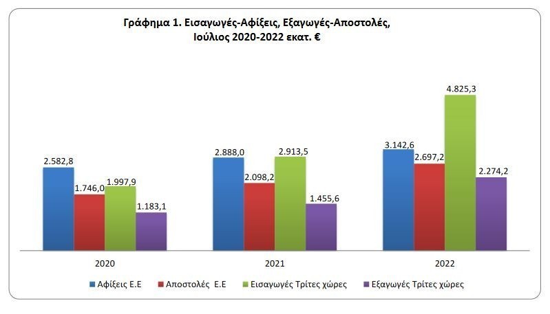 Η συνολική αξία των εξαγωγών – αποστολών, κατά τον μήνα Ιούλιο 2022 ανήλθε στο ποσό των 4.971,4 εκατ. ευρώ (5.075,5 εκατ. δολάρια) έναντι 3.553,8 εκατ. ευρώ (4.213,6 εκατ. δολάρια) κατά τον ίδιο μήνα του έτους 2021 παρουσιάζοντας αύξηση, σε ευρώ, 39,9%.