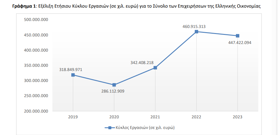 Για το σύνολο των επιχειρήσεων και των δραστηριοτήτων της οικονομίας, ο κύκλος εργασιών το έτος 2023 ανήλθε σε 447.422.094 χιλ. ευρώ σημειώνοντας μείωση 2,9% σε σχέση με το έτος 2022, που είχε ανέλθει σε 460.915.313 χιλ. ευρώ.